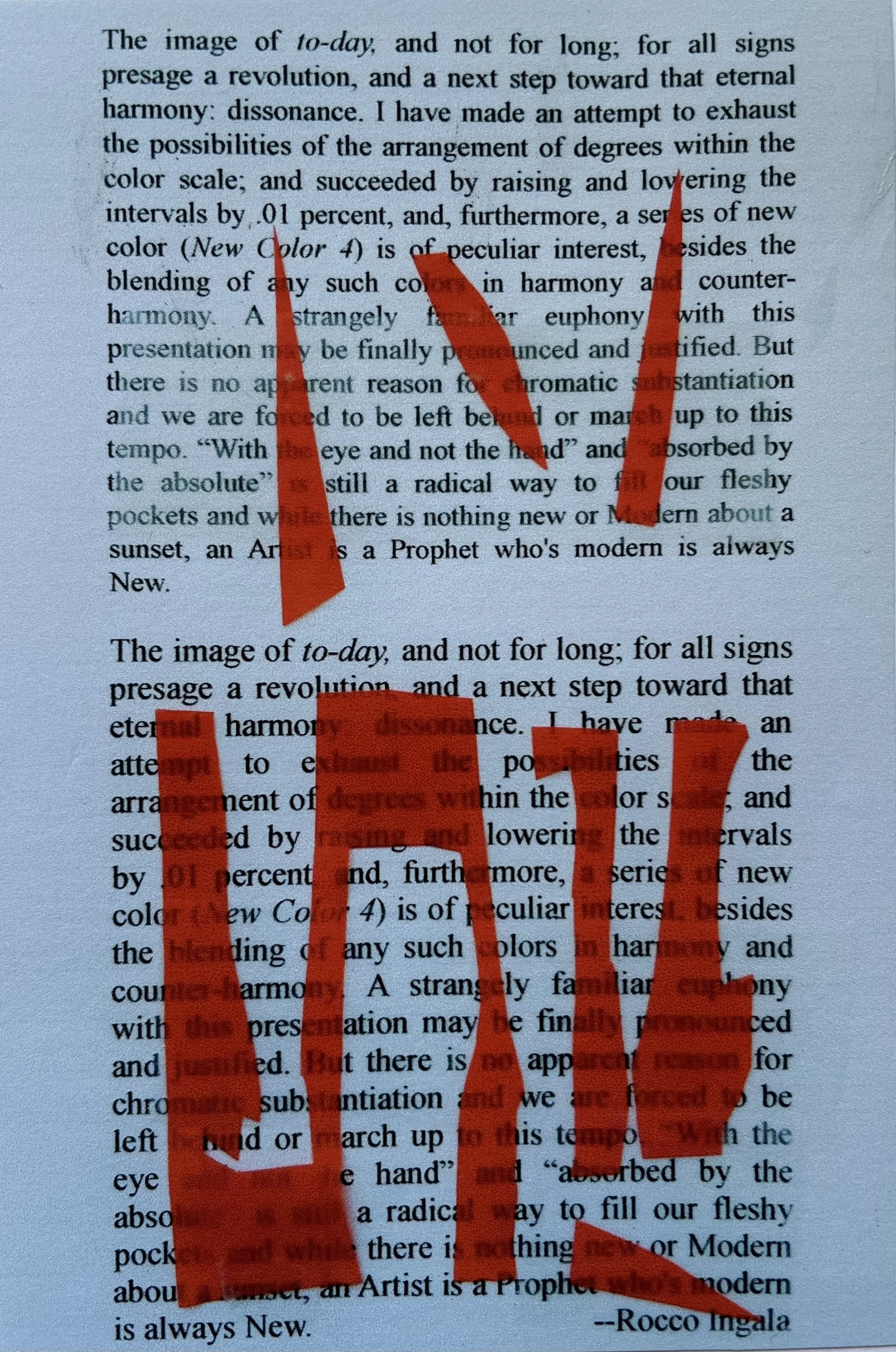 All signs presage a revolution and a next step toward that eternal harmony: dissonance. I have made an attempt to exhaust the possibilities of the arrangement of degrees within the color scale, and succeeded by raising and lowering the intervals by .01 percent; and, furthermore, a series of new color (New Color-4) is of peculiar interest, besides the blending of any such colors in harmony and counter-harmony. A strangely familiar euphony with this presentation may be finally pronounced and justified. But there is no apparent reason for chromatic substantiation and we are forced to be left behind or march up to its tempo. “With the eye and not the hand” and “absorbed by the absolute” is a way of choice.